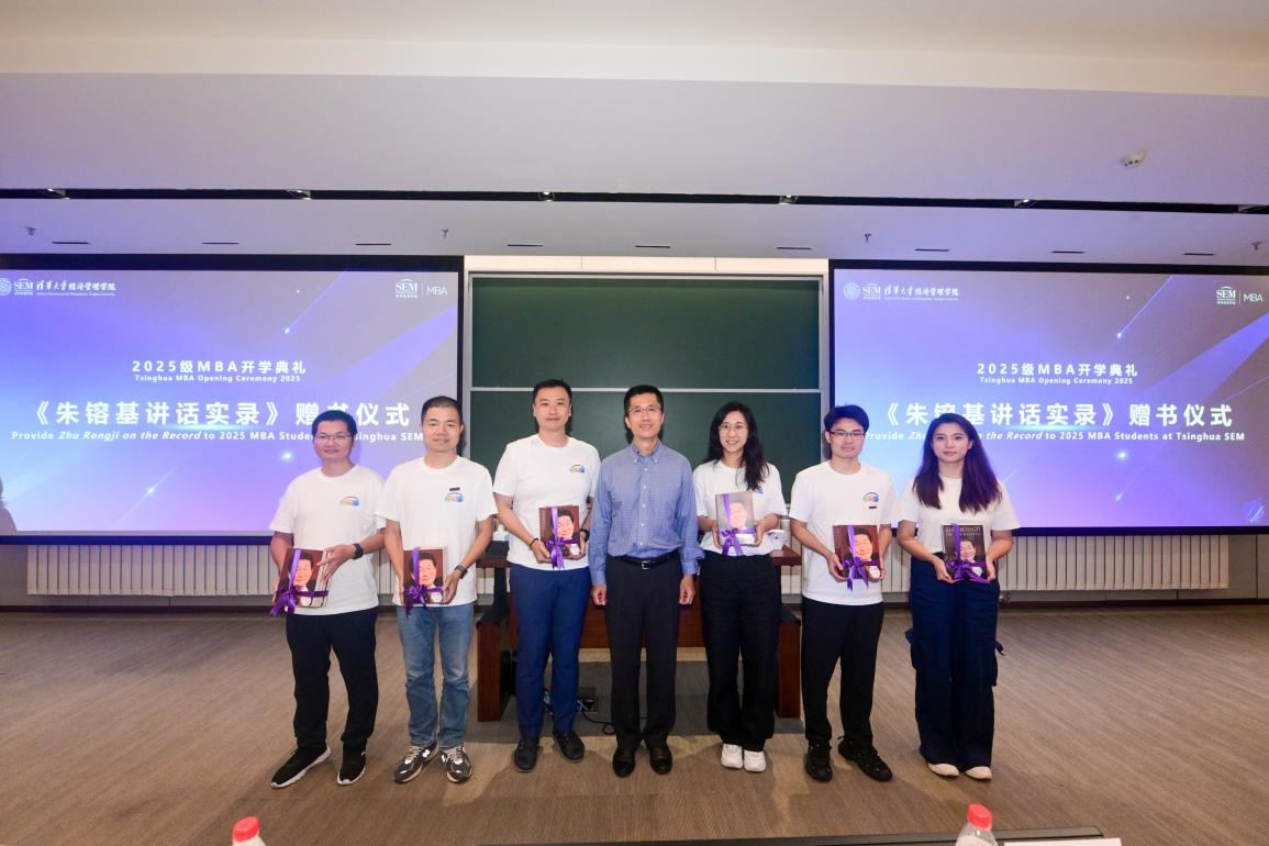 在赠书环节,徐心代表学院为新生代表赠送《朱镕基讲话实录》,勉励大家铭记老院长的嘱托,传承清华精神,践行“自强不息、厚德载物”的校训。