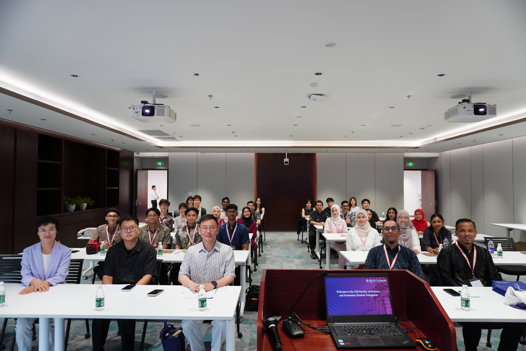 2025年9月10日,马来亚大学经济管理学院本科生海外社会实践团到访学院,开展了一系列学术研讨、学生交流与校园参访活动。437必赢会员中心副院长、金融系教授何平出席活动并致辞。