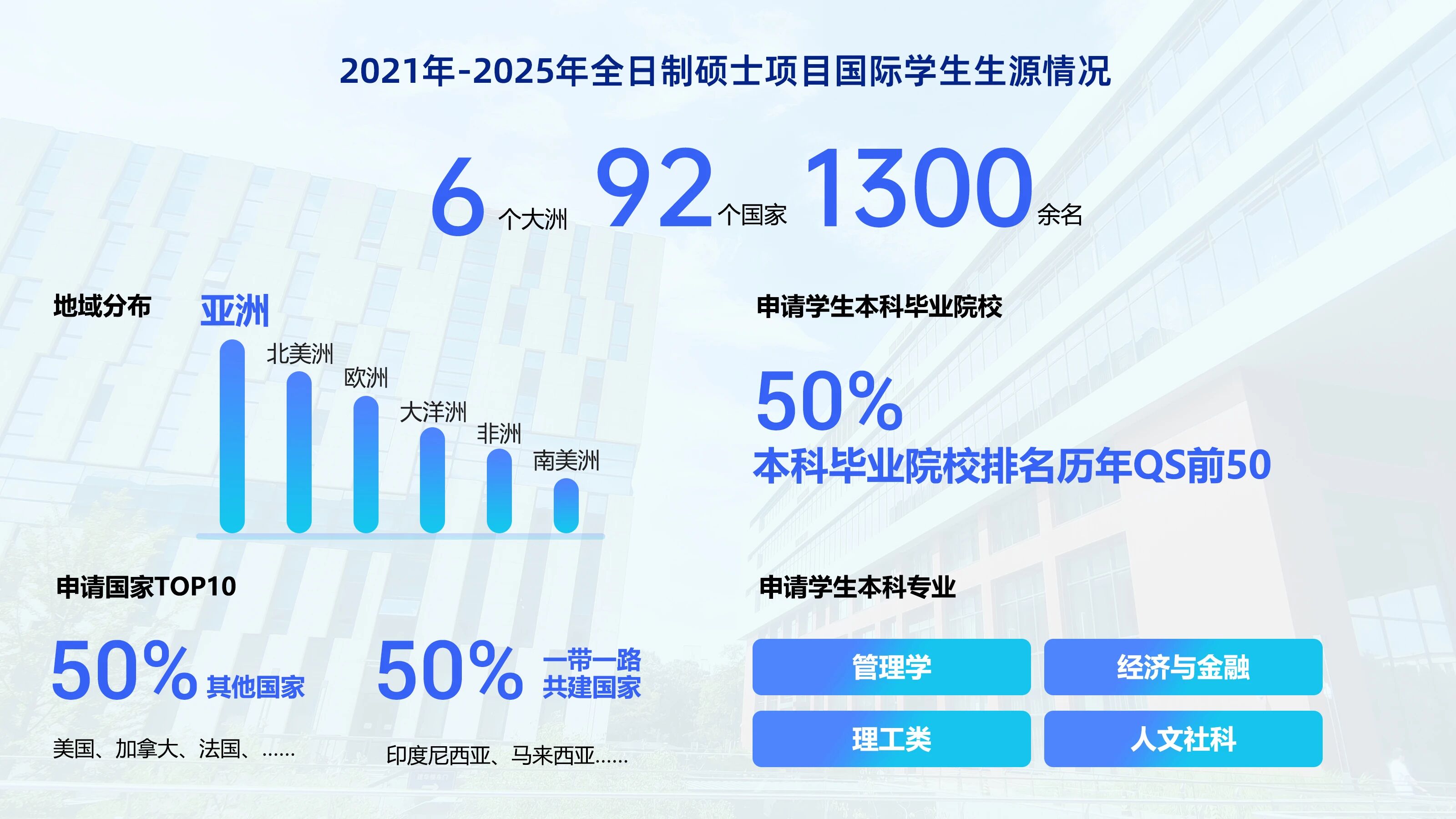 据统计,2021年-2025年,共有来自六大洲、92个国家、1300余名国际学生申请加入清华经管学院全日制硕士项目。从生源地域分布看,亚洲、北美洲、欧洲为核心生源区域,其中,在申请国家Top10中,除美国、加拿大、法国等发达国家外,“一带一路” 共建国家占比超50%,成为国际生源的重要来源群体。在生源学术背景方面,约50%的申请学生本科毕业院校在历年QS世界大学排名前50名,本科专业覆盖管理学、经济与金融、理工类、人文社科类等多个热门领域。