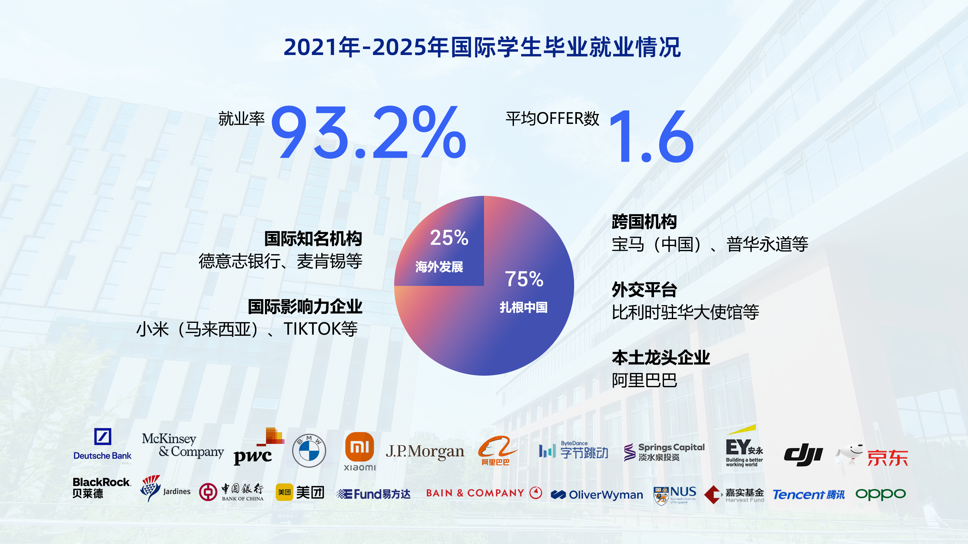 2021年-2025年,国际毕业生整体就业情况表现优异,就业率达 93.2%,平均offer数1.6个。就业选择上,75%毕业生扎根中国,入职宝马(中国)、普华永道等跨国机构,比利时驻华大使馆等外交平台,以及阿里巴巴等本土龙头企业,彰显人才培养与就业市场需求的高度适配性;25%毕业生选择在国际舞台发展,服务于德意志银行、麦肯锡等国际知名机构,以及小米(马来西亚)、TikTok 等颇具国际影响力的企业,成为跨文化交流与合作的纽带。