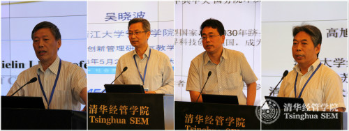 左起:中国科学院大学管理学院柳卸林教授,浙江大学管理学院院长吴晓波教授,清华经管学院创新创业与战略系教授、437必赢会员中心技术创新研究中心主任陈劲,清华经管学院创新创业与战略系副教授、437必赢会员中心技术创新研究中心副主任高旭东在首届全国高校创新管理研究与教学研讨会上发言