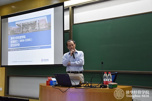 首先,清华经管学院MiM项目学术协调人、市场营销系谢赞教授就MiM项目的历史发展、项目特色、项目安排及招生方式,管理硕士国际联盟(CEMS)的优势及其与MiM项目的合作为学生带来的资源等方面展开说明。谢赞教授介绍说,不同于学术研究型硕士,MiM项目注重培养学生对理论知识的实际应用和对问题的实际解决能力,并通过整合学院在经济与管理领域的优秀师资,为学生带来多样化的课程选择和实践机会,为企业、政府以及各类非赢利组织培养优秀的未来管理者和领导者。清华经管学院作为中国大陆唯一一家CEMS的成员,不仅为MiM学生提供了前往近30所遍布全球CEMS成员学校海外学习与修读法国巴黎高等商学院双学位的机会,同时通过利用CEMS近70家国际知名企业资源,为学生提供更多的实践机会,拓展其全球视野。