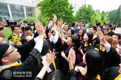 清华经管学院院长钱颖一、Facebook公司首席运营官谢丽尔•桑德伯格(Sheryl Sandberg)与清华经管学院毕业生合影