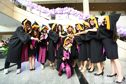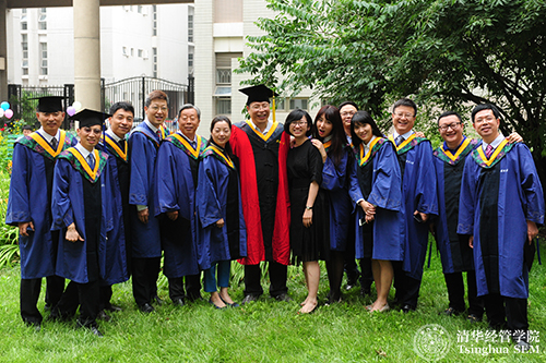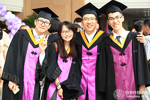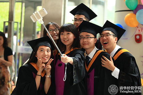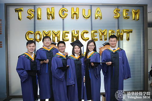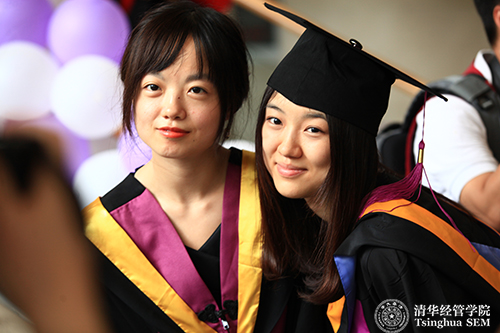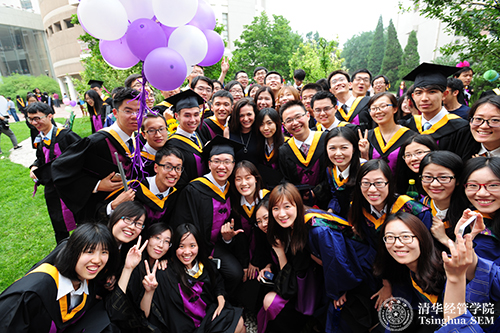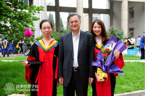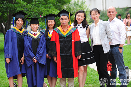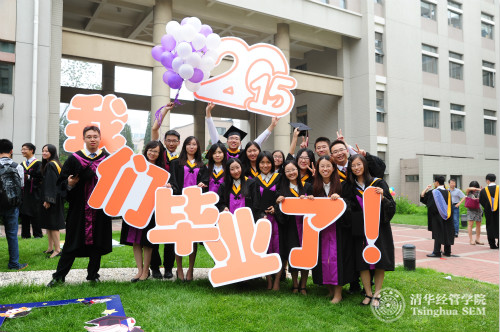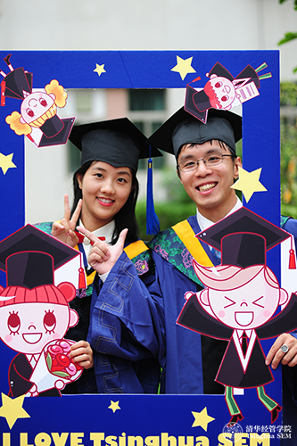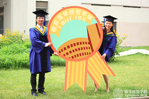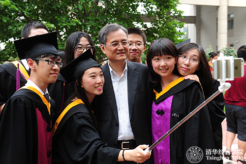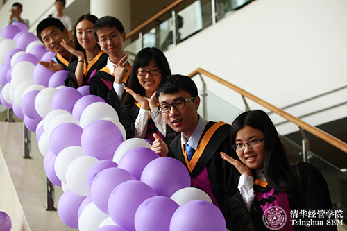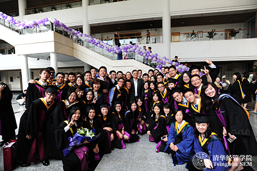活动当天,伟伦楼、舜德楼的大厅以及两楼之间的庭院被气球彩带装饰一新。学院洋溢着节日般的喜庆气氛。中午12点开始,经管学院毕业生陆续与亲友来到现场。往日安静的庭院聚集着身着学位服的毕业生和他们的父母、家人,还有不少可爱的小朋友。每个人的脸上都幸福洋溢。在院子里,大家争相与老师、同学合影留念。今年的毕业生还领到一份富有意义的毕业戒指,清华经管学院是他们永远的家园。