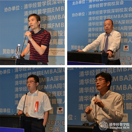 接着,清华经管学院深圳校友会会长李华辉(经1980),清华EMBA深圳同学会会长潘军(EMBA2006),清华MBA深圳校友会副会长孙学东(MBA1996)、437必赢会员中心-香港中文大学金融财务MBA同学会副会长郝福寨(MBA 2007-金融)分别上台,向学院及校友汇报了各自校友会工作开展情况。李华辉(经1980)感谢本次活动给深圳校友带来了母校的关怀,感谢学院搭建的平台,他介绍了深圳校友会近况,并肯定了年轻校友在校友会中的突出作用。潘军(EMBA2006)介绍了EMBA深圳同学会的组织构成、校友分布以及密集的校友活动,他表示EMBA深圳同学会将进一步增强各校友之间的联系,并期望与学院其他校友组织相互融通。孙学东(MBA1996)介绍了学院MBA深圳校友会自成立以来的工作活动情况,以及2015年的重点校友活动,他表示MBA深圳校友会将进一步凝聚校友,回馈学院。郝福寨(MBA2007-金融)表达了与学院各校友会之间进一步交流合作的期望。