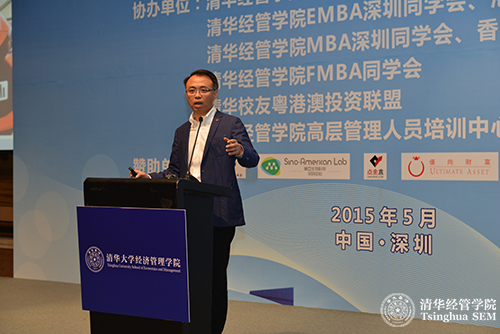 随后,清华经管学院党委副书记朱岩教授以《解析互联网+》为主题展开演讲。朱岩教授从消费和生产两个维度,深入展现了互联网与传统经济的协同效应,从产业链的终端偏移、产业重构、跨产业融合等三个方面说明了互联网+带来的行业变化,用“互联网×传统企业=重资产的轻资产化经营”这一公式说明了互联网的乘数效应。同时,他还从市场与创新机制的重塑这两个方面,深入剖析了互联网乘数效应的动力,并通过校友们在教育、汽车、医药等行业领域的实践案例,来实际举例互联网的行业机遇。最后,他用思想变化是根源,形式变化是皮毛来总结演讲,并号召更多校友通过实践努力,来使清华经管学院的教育思想遍地开花。